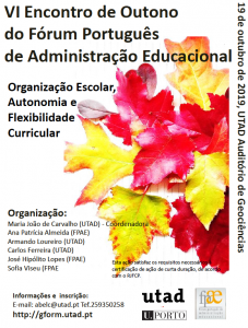No próximo dia 19 de outubro terá lugar o VI Encontro de Outono do FPAE na Universidade de Trás-os-Montes e Alto Douro (UTAD), em Vila Real, sob o tema “Organização Escolar, Autonomia e Flexibilidade Curricular. O encontro tem como conferencista LicÃnio Lima (Universidade do Minho).